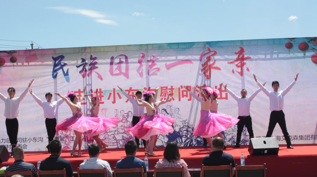 七月的南山陽光明媚,水西溝鎮(zhèn)小東溝村新建的文化廣場一大早已經(jīng)熱鬧非凡,村民不約而同的早早的來到這里忙碌起來了,幫助駐村工作隊和村委做起了灑水、擺凳子、音響設備等準備工作。由“訪惠聚”工作隊和艾克森聯(lián)合邀請的專業(yè)文化團隊,他們帶著精心編排的文藝節(jié)目和小東溝村各族村民,以“民族團結一家親”為主題的聯(lián)歡活動在這里舉行。全村民眾和60多對“結對親戚”歡聚一堂,唱歌、跳舞、雜技、說唱各種表演形式講述著民族團結的親情。