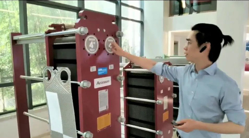 直播重點(diǎn)詳細(xì)介紹了AHRI認(rèn)證板式換熱器的設(shè)計原理和應(yīng)用場合,以及艾克森的換熱器產(chǎn)品設(shè)計特點(diǎn),接口銹鋼的襯套,滿足了過流部件均為不銹鋼,避免水質(zhì)污染,相比橡膠襯套而言使用壽命更長;考慮到日后的維護(hù)需求,螺紋保護(hù)套采用不銹鋼的,能滿足更長時間的使用,產(chǎn)品的板片設(shè)計等技術(shù)核心;整個參觀過程中通過宣傳片和視頻,展示了太倉工廠的生產(chǎn)設(shè)備和加工生產(chǎn)過程。